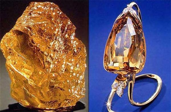 来自南非的Sun-drop黄钻为近年来最震撼人心的巨钻,在苏富比日内瓦拍卖会上拍得1090万美元,创下了黄钻拍卖价格的历史记录。这颗梨形钻石重达110.3克拉,10年才被发现,这意味着它没有以前的所有者,从而添加了它的价值。