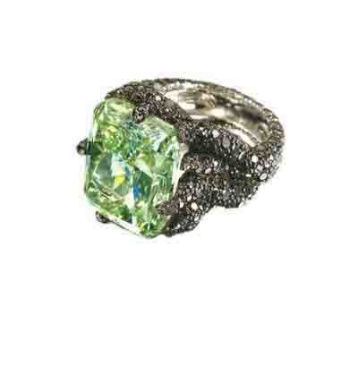 瑞士著名珠宝品牌De Grisogono的这款钻石戒指由25克拉的绿色钻石和7克拉的黑色碎钻组成。这个天价戒指目前陈列在德国德累斯顿城堡。