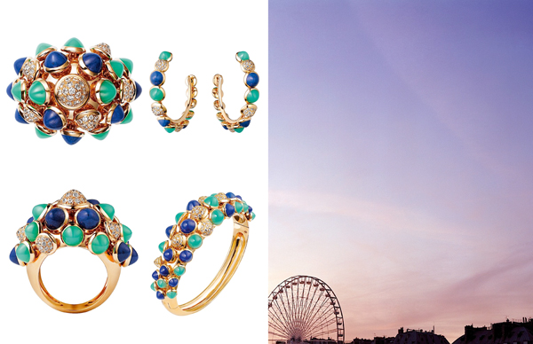 午夜零点的红磨坊、《梦断花都》中莎婷般的佳人正伴着康康舞飞旋,此刻巴黎最是香艳。忧伤敏感的中国人说“烟花易冷、最美不过是瞬间”……浪漫激情的法国人便将这夜空中的虹凝结在了指间、耳畔。金色的球体、蓝色粉色的宝石,是烟火、更是繁星,停驻、然后永恒。