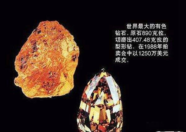 世界上最大的有色钻石。原石890克拉,切磨出407.48克拉的梨形钻,在1988年拍卖会中以1250万美元成交。
