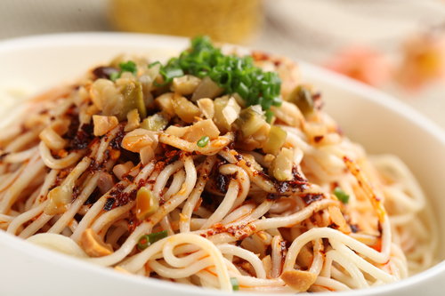 担担面是著名的成都小吃。用面粉擀制成面条,煮熟,舀上炒制的猪肉末而成。成菜面条细薄,卤汁酥香,咸鲜微辣,香气扑鼻,十分入味。此菜在四川广为流传,常作为筵席点心。担担面中最有名的又要数陈包包的担担面了,它是自贡市一位名叫陈包包的小贩始创于1841年。因最初是挑着担子沿街叫卖而得名。过去,成都走街串巷的担担面,用一中铜锅隔两格,一格煮面,一格炖鸡或炖蹄膀。现在重庆、成都、自贡等地的担担面,多数已改为店铺经营,但依旧保持原有特色,尤以成都的担担面特色最浓。