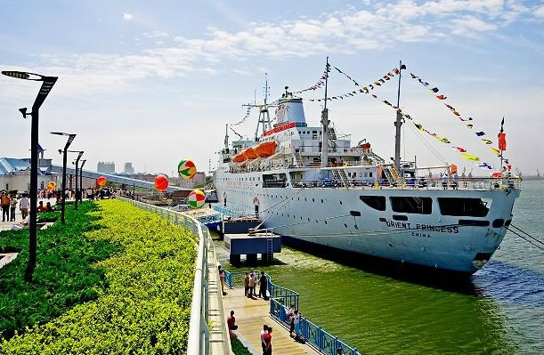 "东方公主"号游轮:船长150.28米,宽21米,排水量10298吨,分为八层,可装载游客350人,船员150人。船上设施齐备,包括:客房、餐厅、电影院、卡拉OK、游戏室、桑拿室、游泳池、保龄球、会议室等。拟对其进行更新、升级、改造成为集观光、休闲、娱乐、餐饮、演艺于一体的多功能游轮,停泊在塘沽最繁华的商业街道岸边。