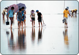 与北戴河、青岛、大连等海滨浴场相比,天津海滨浴场有其独特之处。由于这里的沙滩极为平缓,坡度仅为千分之一,故潮差很大。潮涨时,平缓的沙滩形成水深适宜的辽阔天然浴场,泳客可到大海远处畅泳。潮退时露出2-3公里宽的沙滩,成为赶海的理想之地。浴场的面积约18万平方米,从海岸向海滩修筑了一条宽10米、长600米的引堤,连接引堤的是一个与海岸平行的50米宽、5.5米高、520米长的人造沙滩。游人在宽阔平坦的沙滩上可尽情享受拾贝、捉鱼、抓蟹等乐趣。