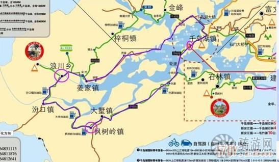 枫树岭 9Km 大墅镇 5.5Km 塔山 6.3Km 安阳 24Km 许淳加油站 12Km 上江埠码头 下船后8Km 千岛湖镇