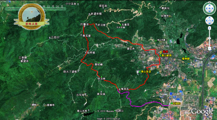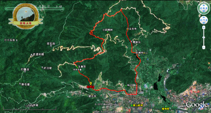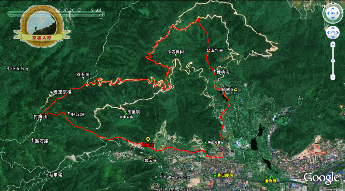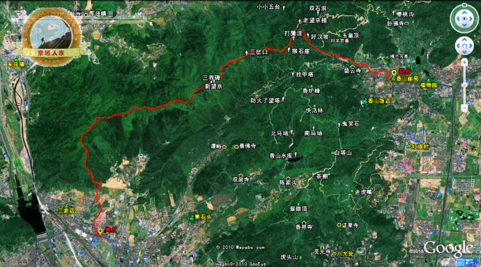 乘公交至香山邮局,从香山邮局路口右转,沿西北方向过碧云寺后继续西行,在公路急弯处沿小路上山。经好汉坡至最高点打鹰洼(650m),交叉口处往北走至老望京,再沿西北方向山脊小路经小小五台到东山村后。由东山村乘公交回。线路全长约13km,上升约560m。
