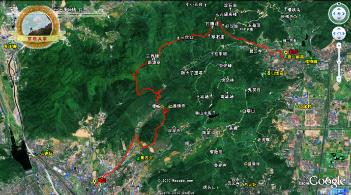 乘乘公交至香山邮局,从香山邮局路口右转,沿西北方向过碧云寺后继续西行,在公路急弯处沿小路上山。经好汉坡到打鹰洼,沿山脊防火道向西南方向行,经三岔口、新望京,再沿山顶小路西行下山至三家店。由三家店乘公交回。线路全长约15km,上升约700m。