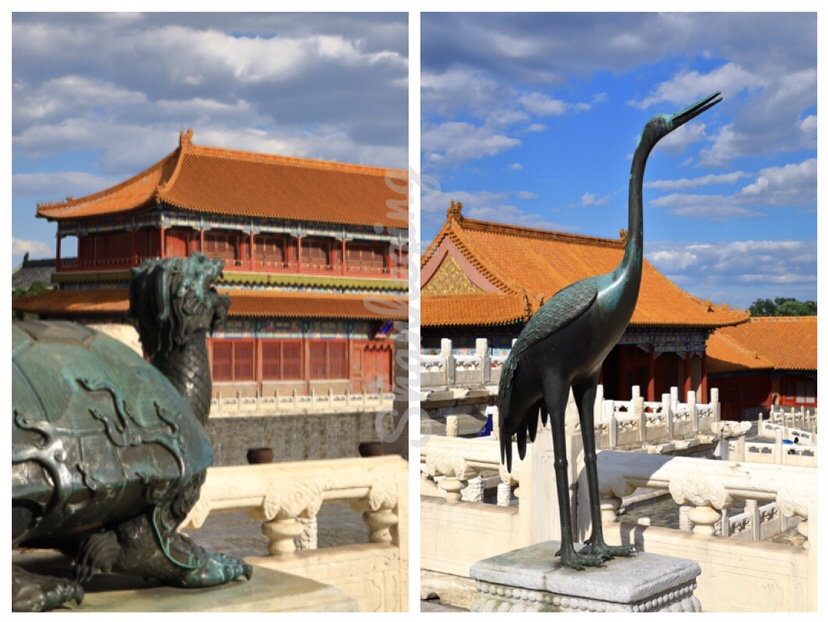铜龟与铜鹤各一对,陈列于太和殿丹陛之上左右两侧,用于大典时燃香。典礼时烧起檀香松枝,香雾从铜龟、铜鹤口中吐出,太和殿烟缭雾绕如深处云端。