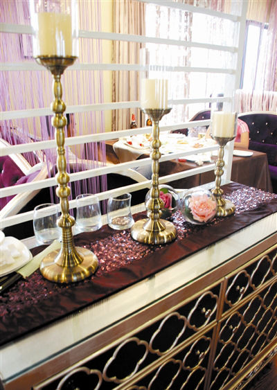 高大的红椅靠背多多少少有点儿私密空间给自己,可以随意的靠在上面,或幽雅,或随意于紫红色的空间中展示自我,而宽大的实木矮桌打造出的临窗风景又是一翻风情,在沙发上歪着身子看杂志,或许是不错的选择,只是,千万不要让自己的脚丫在尚未打造可爱的时候就露在外面,以免影响了其他食客的兴致,当然,美女另当别论。