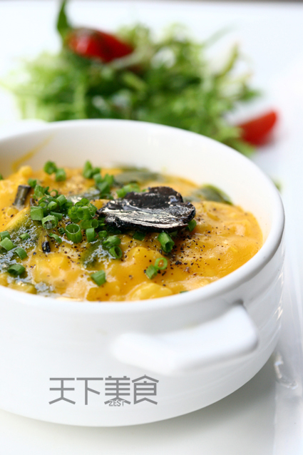 一道应季菜品。运用的主要食材是西班牙黑松露、南瓜和意大利米。南瓜适用于深秋初冬,意大利米淀粉含量极高,黑松露鲜美而营养价值高,菜品整体味道浓郁而不油腻。