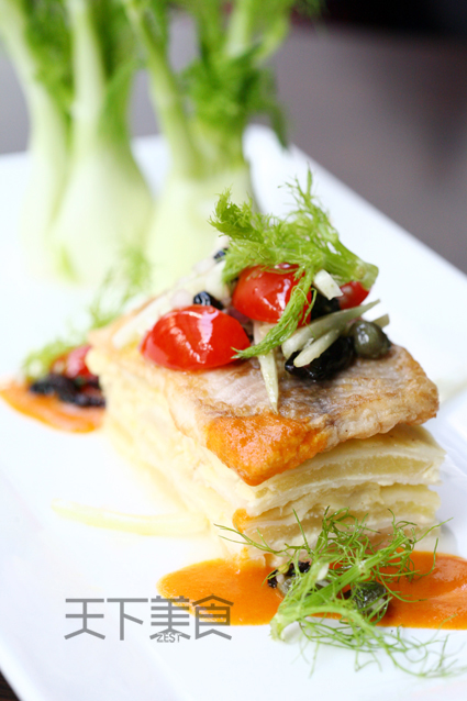 这道菜品的创新特点是缜绸鱼的应用。这种江海交汇处的鱼肉质有嚼劲,烤甜椒汁与之搭配起到去腥的作用。北京餐厅中用缜绸鱼的并不多,只有日餐厅用来做生鱼片。