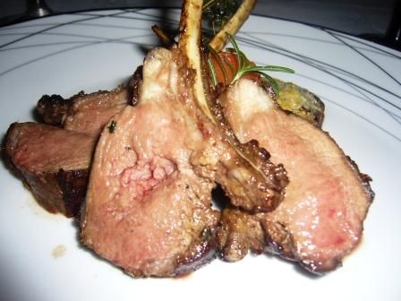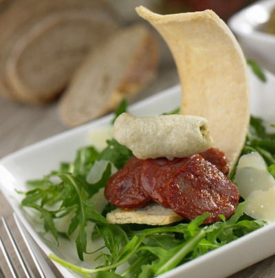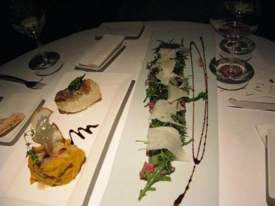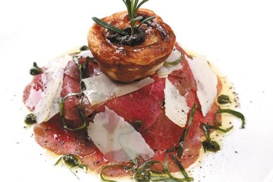肥嫩牛腰肉,腰肉经过腌制,五分熟煎烤,柔软细嫩。上覆芝麻菜沙拉、硬干酪屑、托斯卡油和香醋。