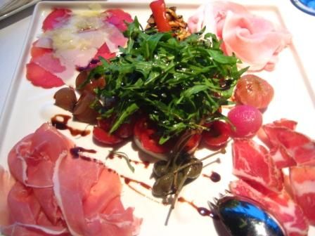 Antipasti意大利开胃凉菜拼盘,配口感迥异的切片火腿,有烟熏火腿、杯形香肠、以及被称做帕尔玛和喀卡布里乔莎(Capricciosa)的各种意大利火腿,并配有意大利硬干酪。