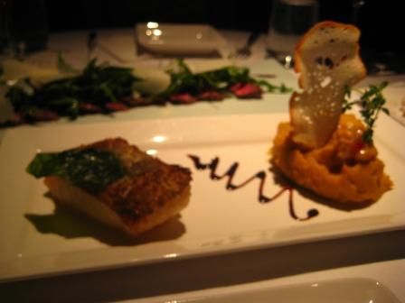 鳕鱼南瓜汤,鳕鱼一面油煎,另一面烘烤,以便锁住水份。南瓜汤香甜可口,隐隐地有一点姜的回味。汤的质地口感有点像土豆泥配鳕鱼,香浓甜腻。