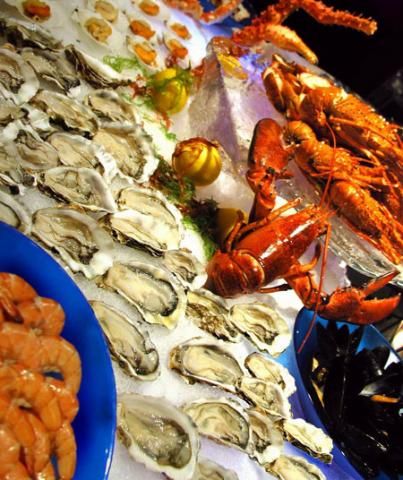 烤肉台,你可以选择牛排,小羊排,或是其他的肉,配菜很多,如蘑菇,熟肉,番茄,柿子椒等等。两种调味酱,番茄酱和绿色香蒜酱都可以任选。另一面的餐台供应有新鲜的龙虾和牡蛎。