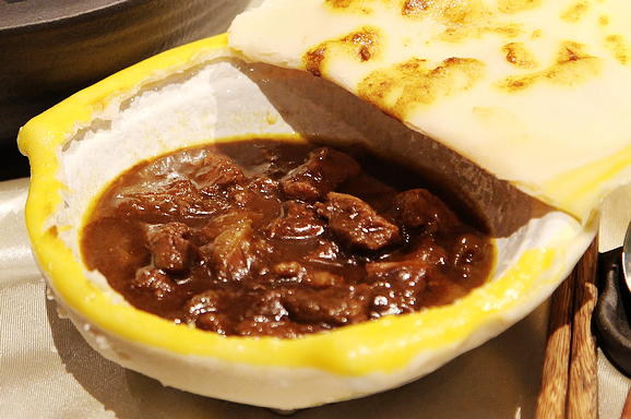小心翼翼切开三分之二的面饼,充斥鼻腔的是咖喱异香,挖一勺裹满深棕色咖喱汁的牛腩,汁稠滑如巧克力酱,攻占舌尖的是鲜香辛辣,霸占口腔的是如公蟹蟹膏般的胶着感。