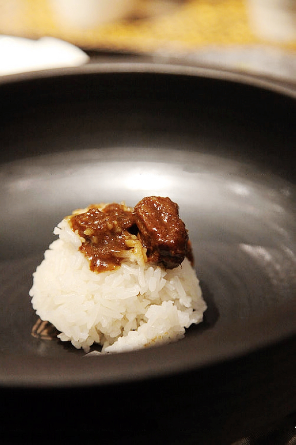 牛腩是牛腹部到牛肋附近的带筋肥瘦肉,若细分,有坑腩、筋腩、腩角、腩底、挽手腩和熊猫腩之分,雕爷牛腩选用的是有韧劲有嚼感不过于柔软的鲁西黄牛牛腩。牛腩并不大,基本无肥,更接近于“丁”而不是“块”,咖喱味的确有深度,但辛辣度突出,打破平衡。