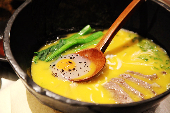 长勺送一勺汤汁,长筷夹一片牛腩,入口之时感受至纯的丰腴结构。这碗面有太多的亮点,一般面里搁鸡蛋,它却别出心裁用鸽蛋——圆形木勺托起的荷包鸽蛋,透明如玉的卖相、剔透的质感和柔嫩的口感相当讨喜,放在牛腩面中,撒上黑松露渣,也让“面相”增值不少。而专门为吃面设计的玄色厚碗,碗边预留有一定的倾斜度,上沿糙厚防滑防烫,下沿光薄体贴喝汤的嘴巴。原以为500万买断食神的配方只是个搏眼球的噱头,谁承想吃完只想大叫一声「这500万,值了!」