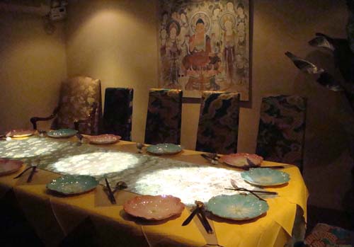 所有的包间都是长条形的,大家坐在桌子的两边吃饭。楼上午餐不开放,楼下大概有五六个包厢、十几个双人座。我个人不是很喜欢包间,长条形桌子,不分餐,夹菜什么的很不方便,大家聊天也受到影响。两个人来吃坐在双人座那里最合适——又安静,又能感受气氛。在进门一侧还有一个买健康食品的柜台,没仔细看,好象是有机食品之类的吧。