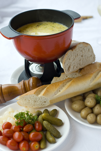 冬天的瑞士,朋友相聚在一起吃奶酪火锅,方便而有气氛,其热衷的程度一如重庆火锅在中国。源自中欧的美食,主角当然还是面包与奶酪。厨师Raymond先生介绍:吃奶酪火锅容易腻住,可佐以酸黄瓜、酸洋葱、小西红柿,也可将西红柿、土豆蘸奶酪吃。为不使奶酪变硬,需边吃边搅动。