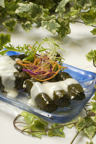 希腊腌制的葡萄叶、牛肉馅米饭(生)、希腊香草、柠檬白汁、盐、胡椒粉