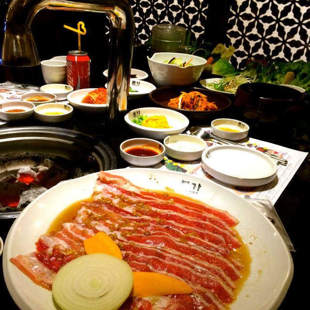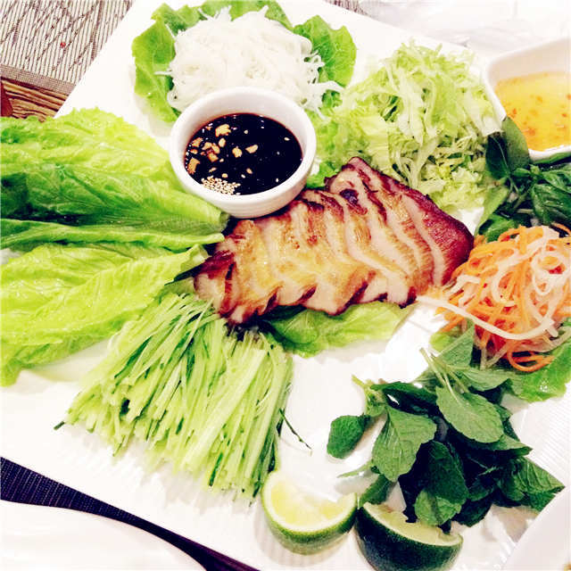 满心尝五花肉是店里另一招牌,直接蘸料、用蔬菜卷和肉卷小葱三种都试过后,个人觉得卷小葱很特别,也是别家烤肉店没有的,滋滋流油的肉香卷着小葱的清香,真的好赞!附赠的蔬菜船,怪不得大家都这么叫,比桌子还长的一大盘满满当当,小菜无限上,南瓜泥的不同之处在于里头有花生米!