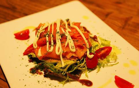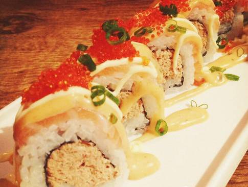 木质结构的装潢让人感觉像是置身于日本的某个居酒屋。木头桌椅、昏暗光线,温暖随意,真是非常有家的感觉。冰鲜美味的三文鱼,店里自创的雷雷卷,内里卷着金枪鱼,外面包着三文鱼,双色鱼籽点缀特别诱人。