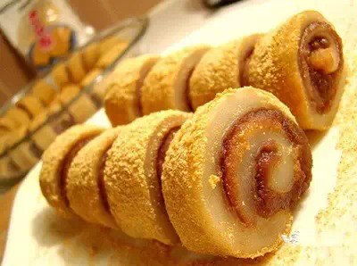 驴打滚是北京传统的风味小吃,知名度颇高。它是用一层层的粘面加上红糖和炒熟的黄豆面卷成的,入口又粘又甜,还带有淡淡的桂花的香味,百吃不厌。