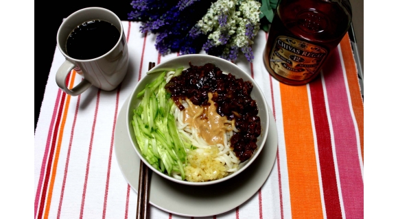 是北京富有特色的食物,由菜码、炸酱拌面条而成。将黄瓜、香椿、豆芽、青豆、黄豆切好或煮好,做成菜码备用。然后做炸酱,将肉丁及葱姜等放在油里炒,再加入黄豆制作的黄酱或甜面酱炸炒,即成炸酱。