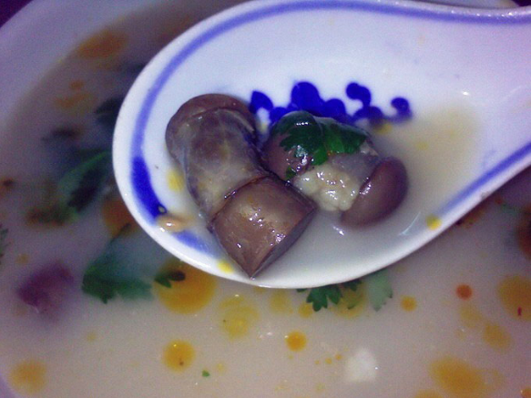 这早点里还有一样不能不说,那就是炒肝儿。这炒肝儿好象是清末就有了,按老人儿们说,是清末由前门外鲜鱼口“会仙居”的“白水杂碎”改进的,这白水杂碎呐,是以切成段的猪肠、肝、心、肺加调料用白汤煮,但不太讲佐料,大家伙儿不太好系这口。于是乎掌柜的将心、肺去掉,换了个称呼叫“炒肝儿”,这一改不要紧,还真改出一番名堂和红火来。