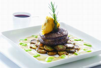 原料取自澳大利亚菲力牛排,葡萄牙小土豆,意大利熏火腿,布森干酪及新鲜的迷迭香和翠蚕豆。内藏了香草,月桂叶及奶酪的腌制过的牛柳,再经煎锅里的一番游历,葡国风情随香味由内而外禁不住地悠然流露……因又有黑胡椒的浓墨重彩,口味香浓略咸,这时咬上一小口金灿灿的蚕豆玉米饼或来一片葡国小土豆,滋味更是唇齿留香余韵悠长。若直接蘸了配有奶油和芥末的玛若兰汁入口,味道同样妙不可言。别忘了,翠蚕豆的清新爽滑,同样会给这道菜的口感加分。点上一杯西班牙出品的德萨佳阁红酒(Telmo Rodringuez Dehesa Gago),更与黑胡椒,奶酪和香草的浓重口味相得益彰。