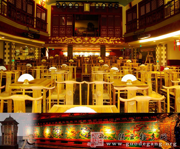 一层设计:剧场采用明清建筑风格,青砖铺地,四周雕梁画栋,高悬仿古灯笼。踏入剧场首先映入眼帘的是雕刻精美的9*2.4米九龙壁;漫步向前,民间艺人现场制作手工艺品---吹糖人、捏面人、葡萄常等活灵活现的展现给观众;进入剧场,您会被一把历经百年的大刀所吸引,这就是当年大刀张耍的那把180斤的大刀。大厅可容纳五百于人,观众席准备的都是古香古色的红木桌椅,环绕大厅还设计有茶铺 、小吃铺 ……。散座按照福、禄、寿、喜排列。