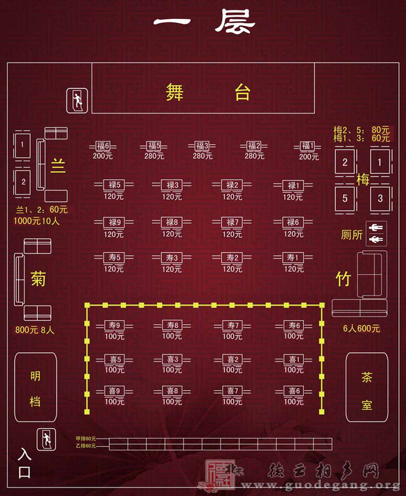 侧包厢(东西1-3号包厢):400元/包厢(含茶水、小吃、果盘)