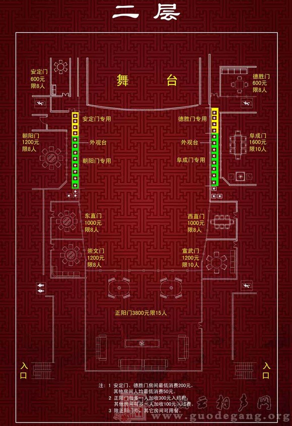 二层设计:二层有九个包间,九个包间按着老北京的四九城门设计,城门上的青砖瓦楞都设计成立体的,屋檐探出。九个包间对应的九个城门,每个城门代表不同意义,有的城门走水、有的城门走粮、还有专走龙车凤辇的城门等等,所有这些含义都会在每个描述出来。正对舞台的包间为德胜门,德胜门包间设有龙座,摆放有九龙椅,包间内大约可容纳20人左右。雅座按照梅、兰、竹、菊排列。