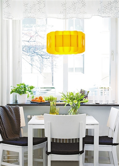 餐厅归属北欧风,多讲究窗明几净的空间感。靠窗而立的简易实木餐桌,静静安放,多了一丝恬静舒适的家居氛围。黑色坐垫一抹深色的出现,让白色空间视觉层次更为丰盈,黄色吊灯外形时尚,色彩明艳,自然是不错的空间装饰。