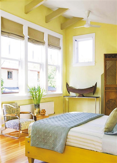 黄色跟我们印象中的阳光接近,在视觉上容易给人以温馨。墙面是浅黄,家具多见明黄,地面实木地板也投射出点点黄色……将黄色融入到卧室各个角落,开敞的玻璃窗将室外光照引入室内,提升暖意,充满阳光正能量。