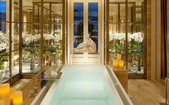 什么叫宏伟和豪华,巴黎四季酒店的这个浴室也许能给你答案。宽敞的浴室利用滑动玻璃门跟套房进行分割,玻璃墙的设置让空间变得宽广,巨大的无边浴缸使得整个空间都显得优雅无比,还加上蜡烛和鲜花的点缀。有时候豪华真的不需要黄金。