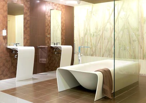 Aquamass公司邀请的两名设计师为其设计的浴缸也都使用了这种材料,它给予了产品柔软的造型和坚固的质量。其中由Michael Bouquillon设计的Strip浴缸,其侧面好似翅膀一样摺叠着,仿佛是纸或织物变化而成;而Paolo Chipiron为该公司设计的Stone One浴缸成为了最好卖的单品,它的形状像一个很深的碗,并附有多种表面材质可供选择,例如人造革、山羊皮或锦缎,或者人造蛇纹、牛皮纹、鳄鱼纹或斑马纹。而其他的材质诸如Quarrycast,它生产出的浴缸相当坚固,同时又很轻便,触感光滑;常用到的还有超薄树脂材质,表面光滑,充满美感之余,还便于运输安装;而名为Cian的材料则非常耐用持久,并且防刮防污。这些新型材质的运用可以赋予现代浴缸精雕细刻的外观,将浴室衬托得更为优雅。这在设计师Tarrington看来,浴室因此“少了许多病房气息,这非常重要,因为现代的室内设计经常把浴室与卧房合并在一起”。