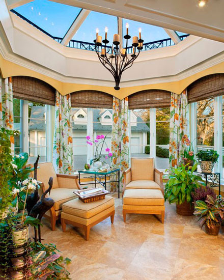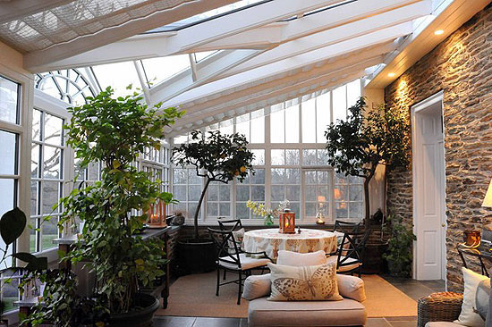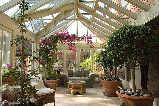 阳光房最适合用来打造室内花园了,因为它有足够好的光照,植物也喜欢。那就好好发挥园艺的美丽。看案例中攀爬着的花朵,只需在屋顶横放一杆,就可以造就如此的繁华。在它下面设置柔软的沙发区,尽可能的享受这份美丽。