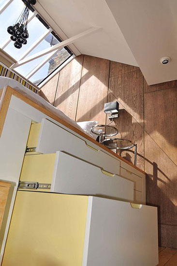 露台比阳台要大,比顶楼空间要小,做成一间狭长型的书房是十分不错的选择,顶上用带有弧度的玻璃将房间“笼罩”,阳光毫不吝啬的射入屋中。房间的布置按照普通的室内书房而设,转角大书桌贴合着墙角延伸,面朝阳光留住许久温暖,后端的墙壁则设计为入壁式书架,简单而实用。