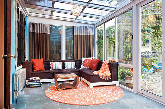 阳光房中的区域被一分为二,一段被设计成小客厅,由合适大小的棕色转角沙发靠角落填补,配合上地毯和盖毯,温暖无比。另一段则是被设计成了专属的阅读角,躺椅配合脚凳,一旁再摆上有趣的小边桌,一家人的假日生活就这么惬意的在这儿过了。