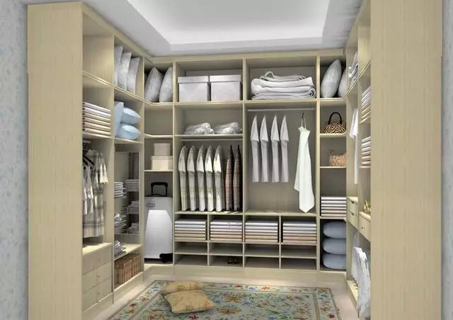 衣柜的最下方最好能有专门的行李区,放置便携的行李箱。时尚女性也可以将这块利用为鞋子收纳区域。