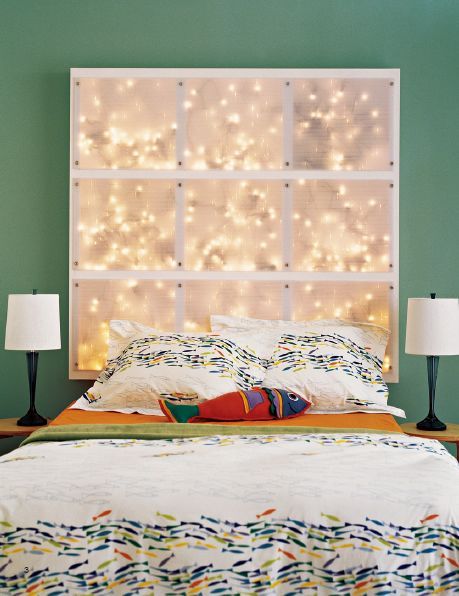 这块床头板能让你联想到圣诞节时透过结霜的玻璃窗看星星的情景。它是由结构简单的木质框架组成,首先将它钉在墙面上,并在木框架后面挂上几串小灯,你可以选择节日或开PARTY后剩余下的彩灯。节日串灯的光线透过半透明板过滤,显得格外柔和浪漫。