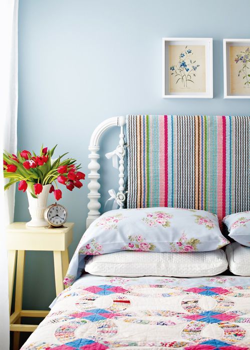 家居卖场会有耐磨的彩条纹挂毯,既可当垫子铺在沙发上也可铺在地上当脚垫,我们可以开发它的全新用途。挑选一块比床头板稍窄一些的挂毯直接搭在床头上,两边分别用窗帘钩夹将毯子固定在床柱上,并用丝带系出蝴蝶结。一个粗犷中带点温馨感的新床头就诞生了。
