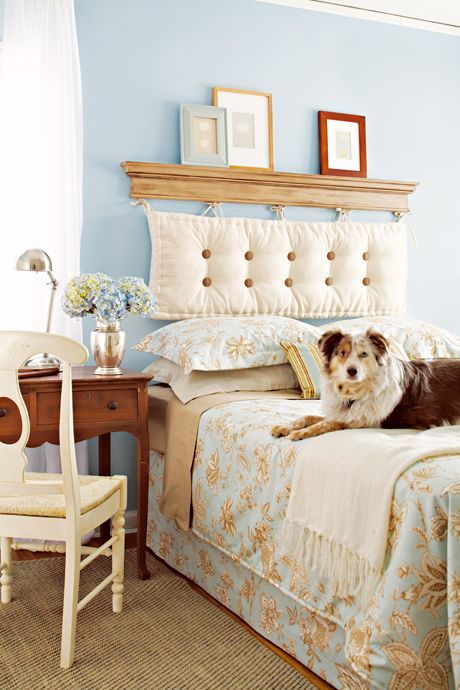 灵感之处:这种床头装饰最适合没有床头的床,饰板上还是一个小型的搁物架。软垫的软硬度还可根据自己的喜好选择或软或硬的填充物。
