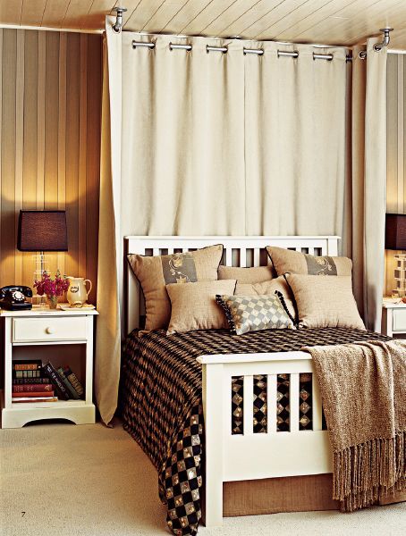 也许装修时剩下的电镀水管可派上用场了,一根T型管连接一根长管和两根短管,分别固定在墙面和顶面上,在布帘的一端打上大号的金属扣眼(窗帘加工店可做),然后穿到管子上,床头两侧延伸出的帘子可围合住床头,更有安全感。