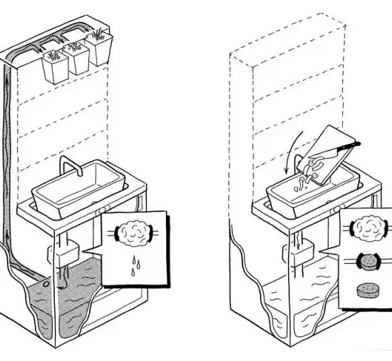 9. 水槽下面有两个下水洞,一边是可以二次利用还算干净的水,可以留着种花、冲厕所。