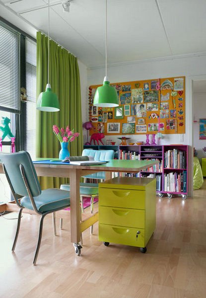 鲜艳饱满的色彩本来就充满了活力,如果不想大面积地使用色彩系家具,简单的几盏色彩吊灯就可以打造出意想不到的效果。