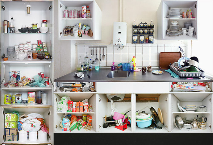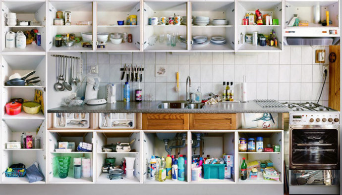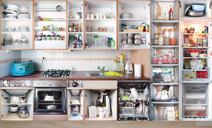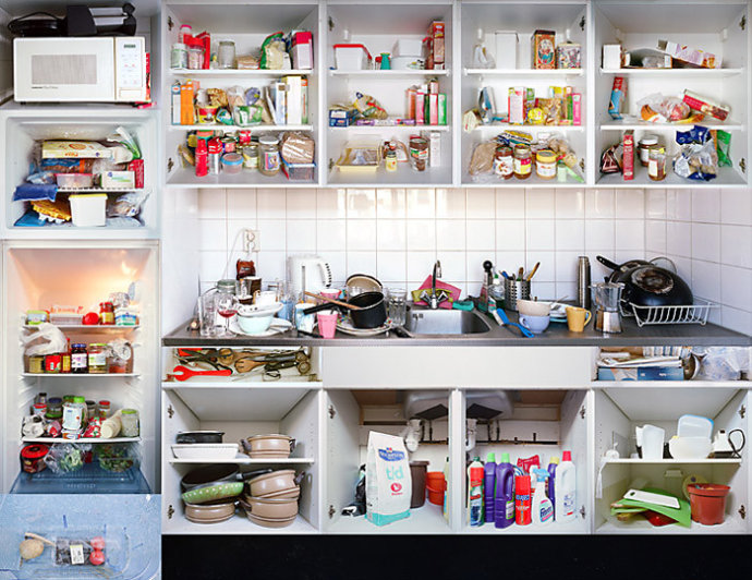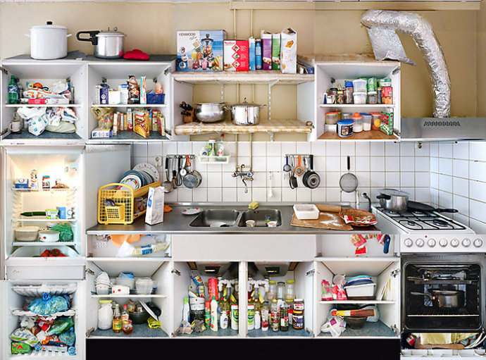 阿姆斯特丹厨房肖像系列作品里,他将阿姆斯特丹城市当中各种族人们的厨房里每壹个柜子,抽屉,冰箱,烤箱都打开并拍摄其中的内容,最后将这些内容合成在壹起。