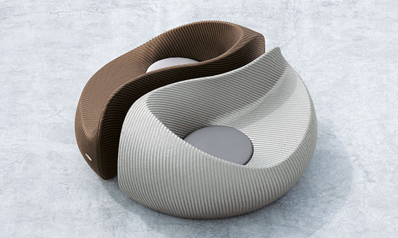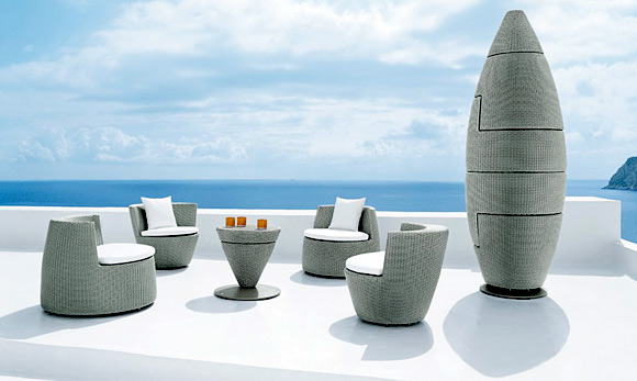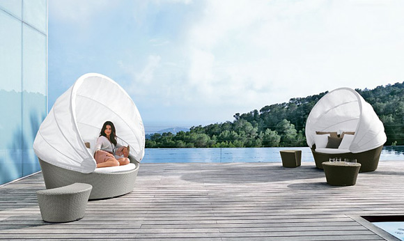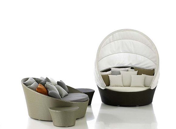设计师以对生活的感悟和理解用灵感创作了一个闲适的蜗居。Orbit双人圆沙发底座设置八个方位的轮轴可自由旋转,并且暗藏方便移动的轮子可随着太阳的移动随意转动。配有月亮形茶几、舒适的坐垫及靠垫,遮阳篷可以自由收放,骨架坚韧触感柔软,亦非常方便拆卸和清洗,另有不带遮阳篷的款式可以布置在室内的厅堂。这款沙发的直径1.6m,适合一家人团坐其中其乐融融;一个人的时候也可以躺在里面闭目冥想,让日光在脸上慢慢移动她的三寸金莲,难得的慵懒……