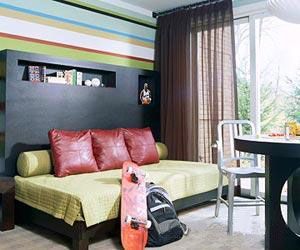 这种超现代的床头设计特别适合十几岁的男孩子。嵌入式的设计,满足了这个年纪的男孩子对展示的需要。